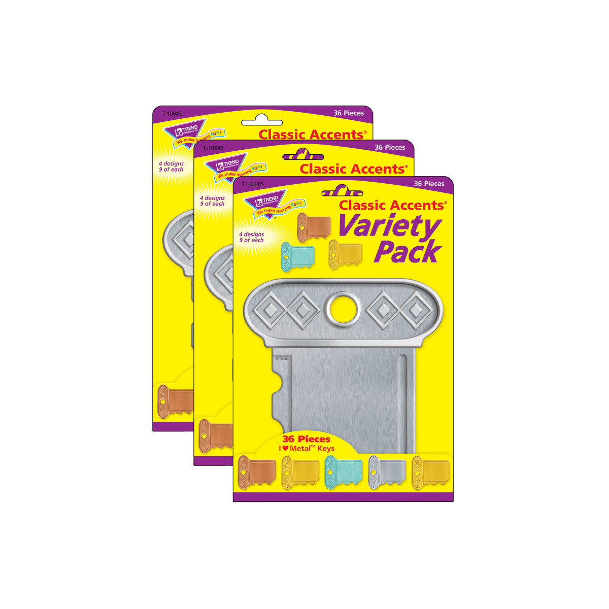 Packed with personality! Endless ways to energize, delight, engage. Label storage centers & lockers, create eye-catching displays, showcase student work, inspire creativity, and reward success. Coordinates with I ♥ Metal™ Collection. Precut and ready to use. Accents are 5½" - 6" tall. Colors included are gold, silver, copper and patina. Each pack includes 36 accents. Sold as 3 packs for a total of 108 accents.