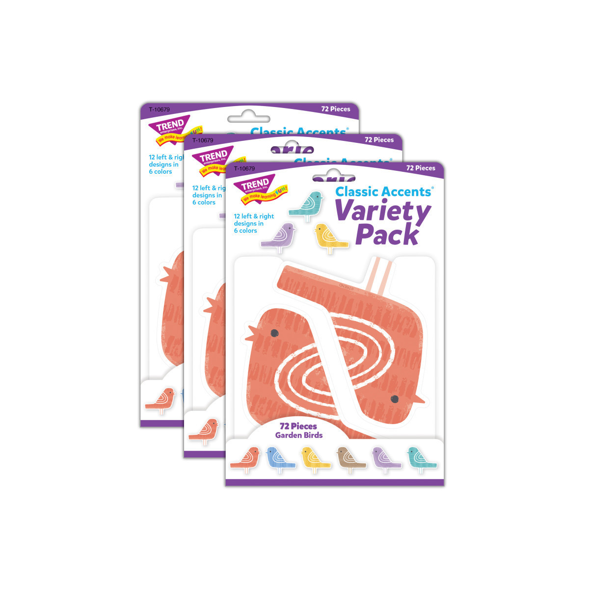 Inspired by nature, calming colors and whimsical designs bring focus to classrooms and fun to crafts. Label containers, lockers and centers, accent displays, decorate walls and posters, showcase student work, inspire creative writing, and reward accomplishments. Endless possibilities! Precut and ready to use in teal, yellow, red, blue, brown, and purple. Left- and right-facing birds, some with beaks open and others with beaks closed. Each pack includes 72 pieces, 12 in each color, about 4" tall by 6" wide. Sold as 3 packs for a total of 216 pieces.