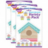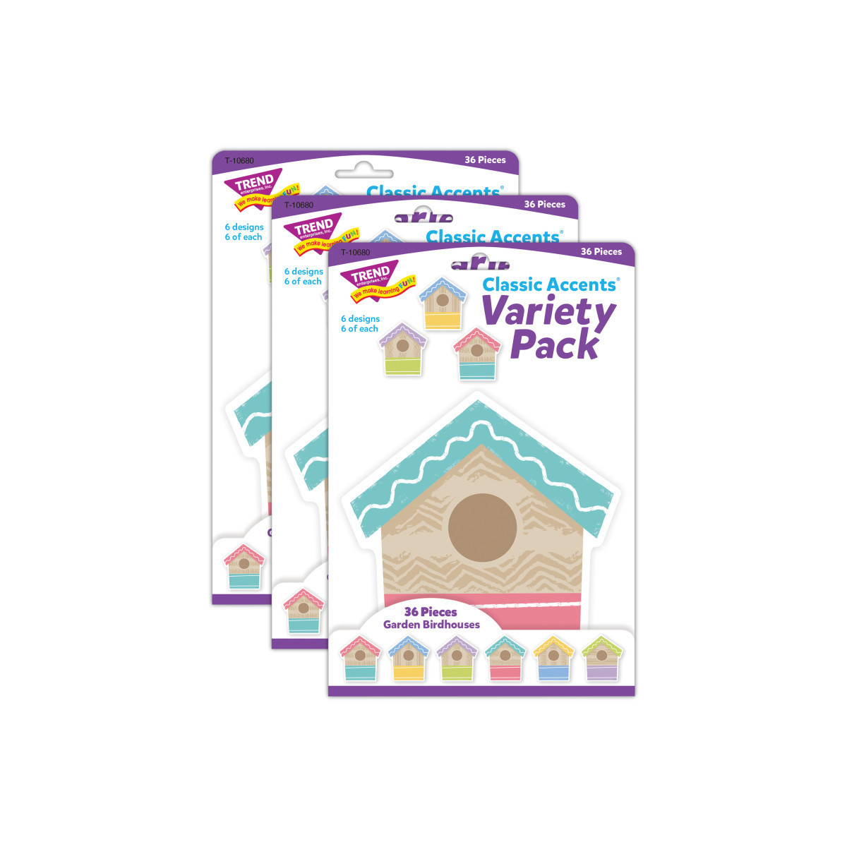 Inspired by nature, calming colors and whimsical designs bring focus to classrooms and fun to crafts. Label containers, lockers and centers, accent displays, decorate walls and posters, showcase student work, inspire creative writing, and reward accomplishments. Endless possibilities! Birdhouses have optional punch-out holes to add pictures or photos! About 6" tall. Each pack includes 36 durable pieces, 6 of each 6 color patterns. Sold as 3 packs for a total of 108 pieces.