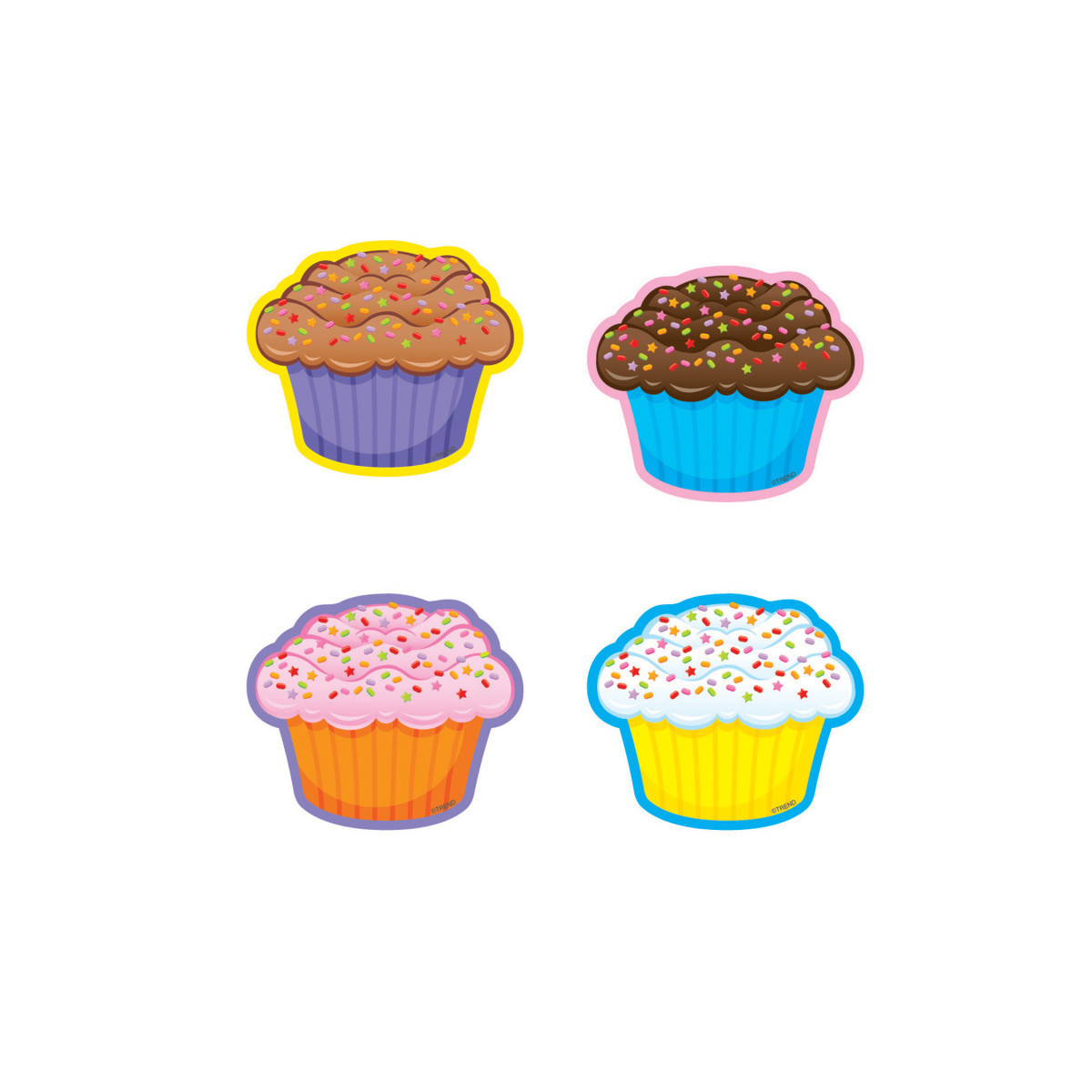- Frosted cupcakes (with sprinkles!) are precut and ready to use in yellow, blue, orange, and purple.