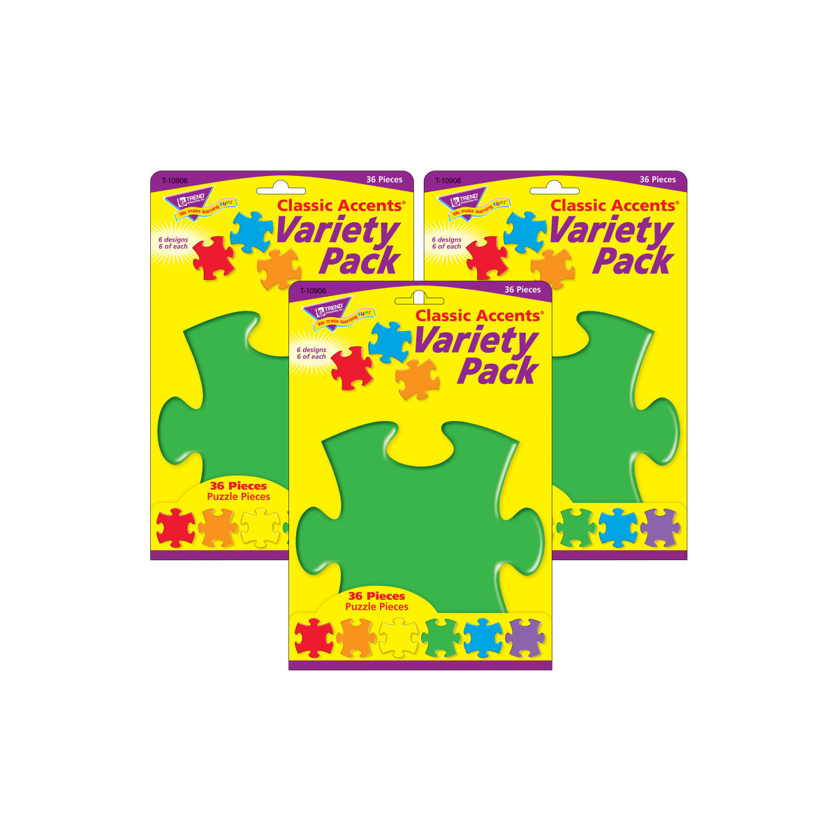 Vibrant designs energize spaces and delight and engage viewers. Feature class photos using linking accents. Label containers, lockers and centers, accent displays, decorate walls and posters, showcase student work, inspire creative writing, and reward accomplishments. Endless possibilities! Precut and ready to use in green, yellow, blue, red, purple, and orange. Durable and reusable. Measures 5.5" - 6" tall. Each pack includes 36 pieces, 6 of each of 6 designs. Sold as a set of 3 packs for a total of 108 pieces.