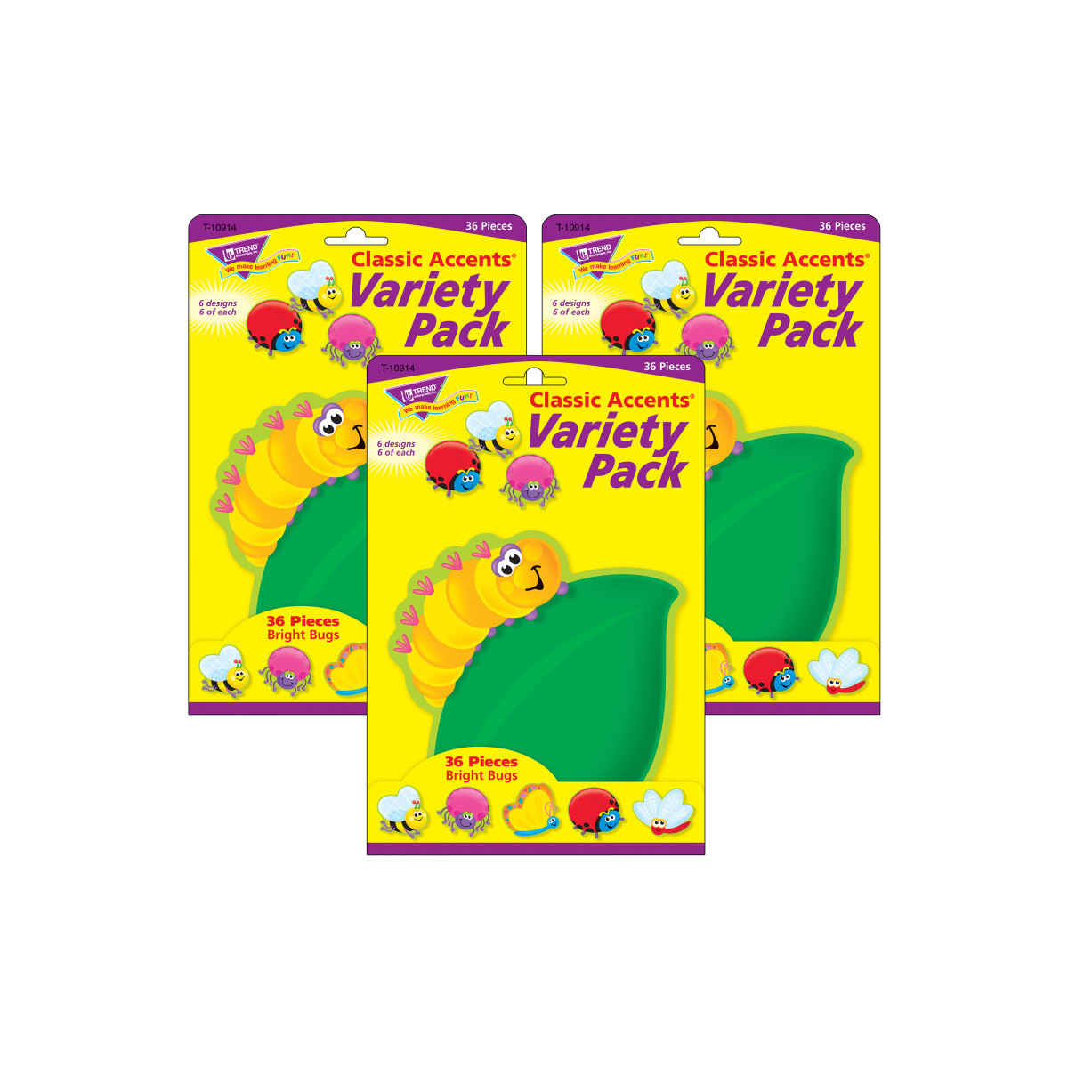 Vibrant designs energize spaces and delight and engage viewers. Label containers, lockers and centers, accent displays, decorate walls and posters, showcase student work, inspire creative writing, and reward accomplishments. Endless possibilities! Precut and ready to use. Durable and reusable. Measures 5.5" - 6" tall. Each pack contains 36 accents in 6 designs. Sold as 3 packs for a total of 108 accents.
