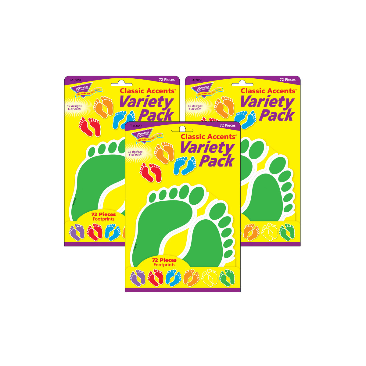 Vibrant designs energize spaces and delight and engage viewers. Label containers, lockers and centers, accent displays, decorate walls and posters, showcase student work, inspire creative writing, and reward accomplishments. Endless possibilities! Precut and ready to use in 6 color pairs: orange, purple, blue, red, yellow, and green. Durable and reusable. 72 pieces. 6 pairs, 6 of each: blue, red, yellow, green, orange, purple. Up to 6 inches tall, 3 inches wide. Sold as a set of 3 packs, 216 pieces total.