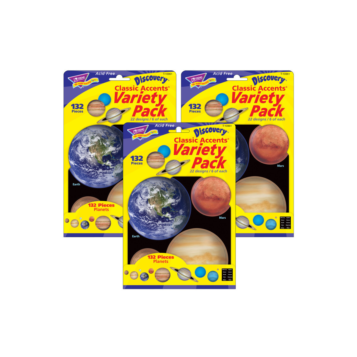 Vibrant designs energize spaces and delight and engage viewers. Label containers, lockers and centers, accent displays, decorate walls and posters, showcase student work, inspire creative writing, and reward accomplishments. Endless possibilities! Precut and ready to use. Durable and reusable. Includes 9 planets, Earth's Moon, and labels. 22 designs, 6 of each. 5.5" - 6" tall. each pack contains 132 pieces. Sold as 3 packs for 396 pieces.