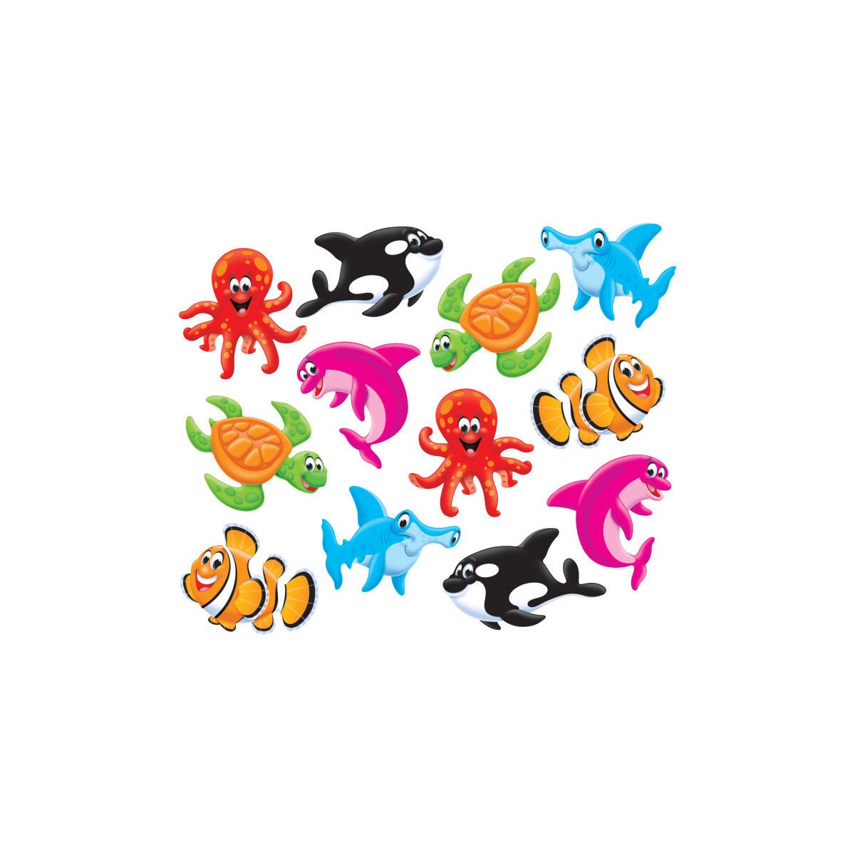 Vibrant designs energize spaces and delight and engage viewers. Label containers, lockers and centers, accent displays, decorate walls and posters, showcase student work, inspire creative writing, and reward accomplishments. Endless possibilities! Precut and ready to use in red, green, purple, and blue. Durable and reusable. 6 designs, 6 of each, left and right-facing. 36 pieces, 5.5" - 6" tall. Coordinates with Sea Buddies Collection.