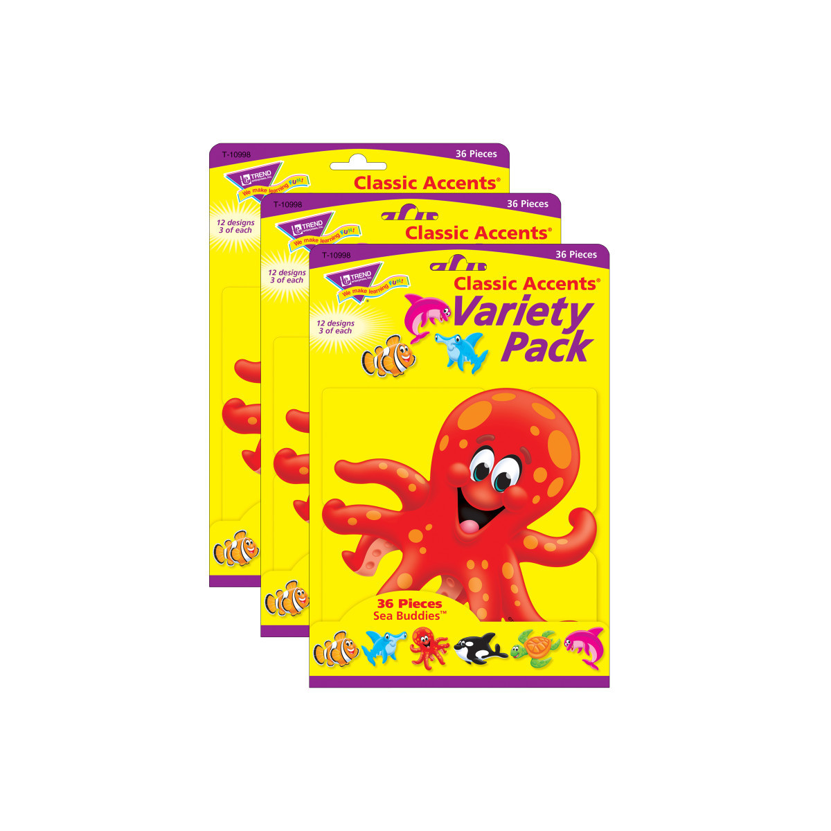 Vibrant designs energize spaces and delight and engage viewers. Label containers, lockers and centers, accent displays, decorate walls and posters, showcase student work, inspire creative writing, and reward accomplishments. Endless possibilities! Precut and ready to use in red, green, purple, and blue. Durable and reusable. 6 designs, 6 of each, left and right-facing. 36 pieces, 5.5" - 6" tall. Coordinates with Sea Buddies Collection. Sold as a set of 3 packs, 108 pieces total.
