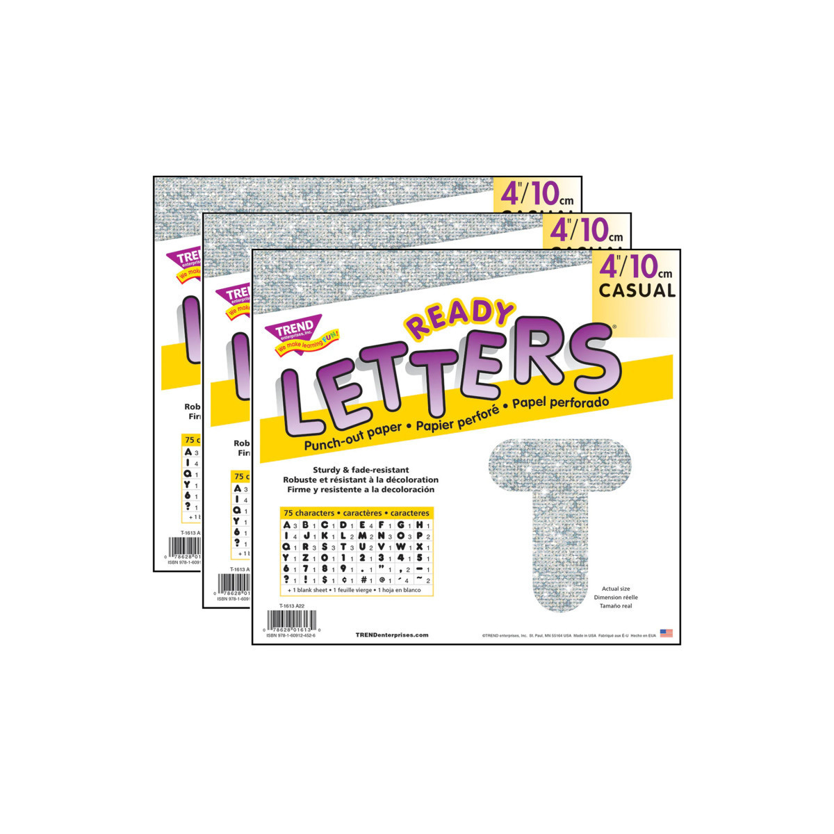 Lively letters, limitless possibilities! Convenient, reusable, and easy to use. Great for student work displays, bulletin boards, signs, banners, news boards, learning activities, labeling, and much more! Fade-resistant colors coordinate with TREND products. Durable. Each pack includes 50 uppercase letters, 10 numerals 0-9, 11 punctuation marks, and 1 blank sheet. Sold as 3 packs.