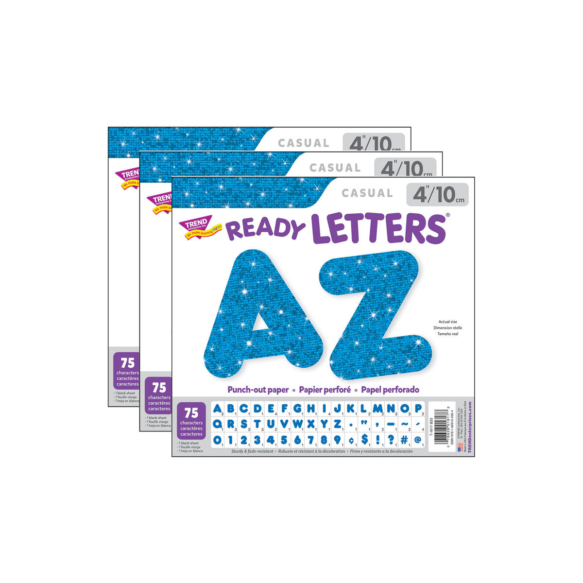 Lively letters, limitless possibilities! Convenient, reusable, and easy to use. Great for student work displays, bulletin boards, signs, banners, news boards, learning activities, labeling, and much more! Fade-resistant colors coordinate with TREND products. Durable. Each pack includes 50 uppercase letters, 10 numerals 0-9, 11 punctuation marks, and 1 blank sheet. Sold as 3 packs.