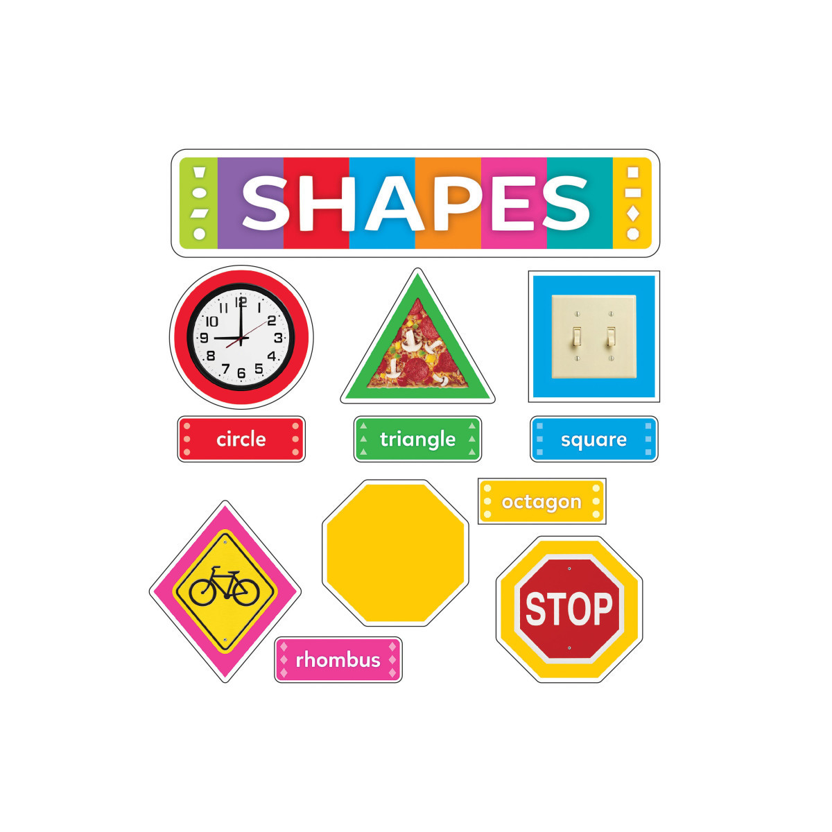 Shape beginner math! Recognize 9 shapes as colorful solids, in photos, and by name. This set provides flexible learning at any pace in any space. Two examples per shape, plus 9 labels and an attractive display header. 29 punch-out pieces in total, with the header measuring 16" x 3-1/2" (40.6 cm x 8.9 cm) and the largest shape measuring 9-1/2" x 5-3/8" (24 cm x 13.7 cm).