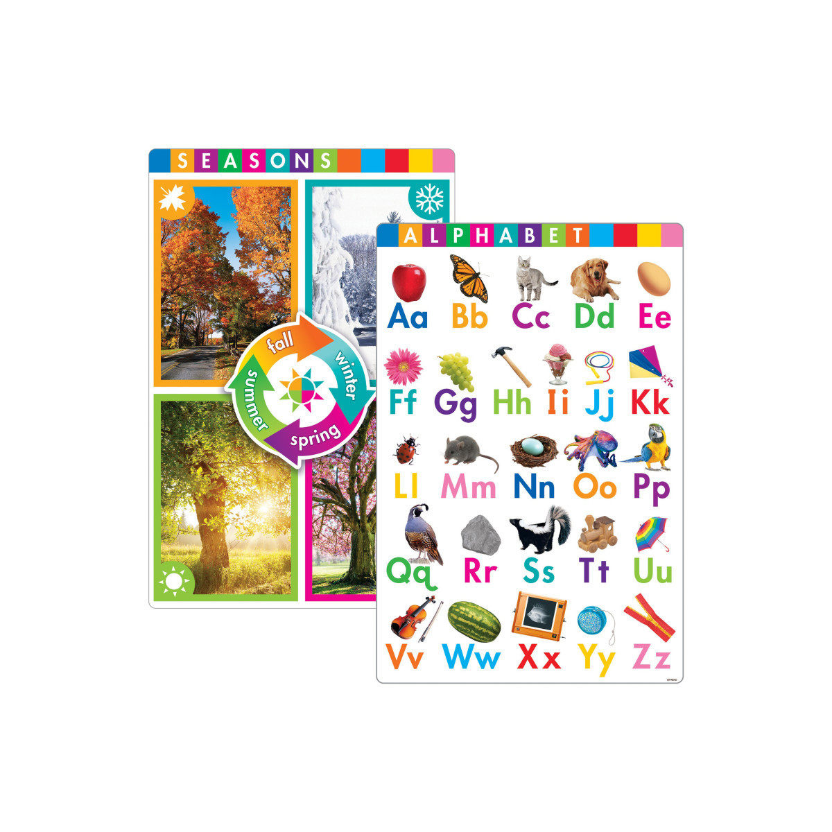 Build early skills with photo-real learning. Includes 8 posters: Alphabet, Numbers 1-10, Colors, Shapes, Opposites, Five Senses, Weather, and Seasons. These punch-out posters measure 10-3/4" x 16-1/8" each (27.3 cm x 41 cm).