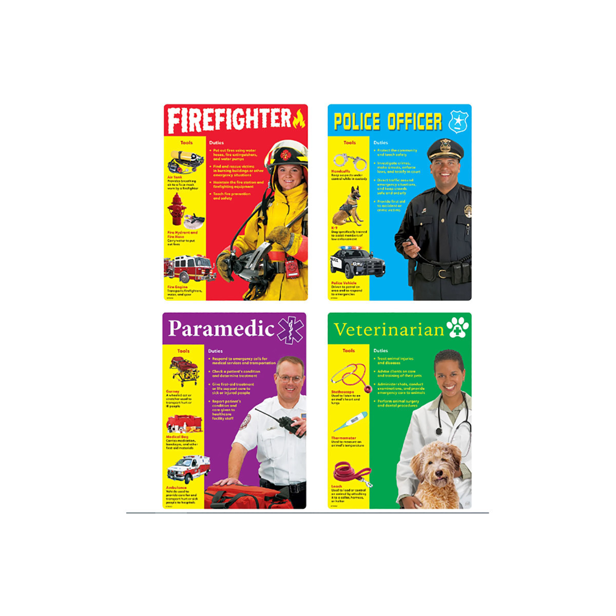 This set features posters for Police Officer, Construction Worker, Delivery Person, Dentist, Doctor, Farmer, Teacher, Mail Carrier, Highway Worker, Trash Collector, Park Ranger, Paramedic, Veterinarian, Nurse, and Grocer. 16 posters total, each 10-3/4 inches x 7-7/8 inches each, printed on durable, heavier-weight paper and packaged in an easy-seal reusable bag for storage. Made in the USA.