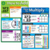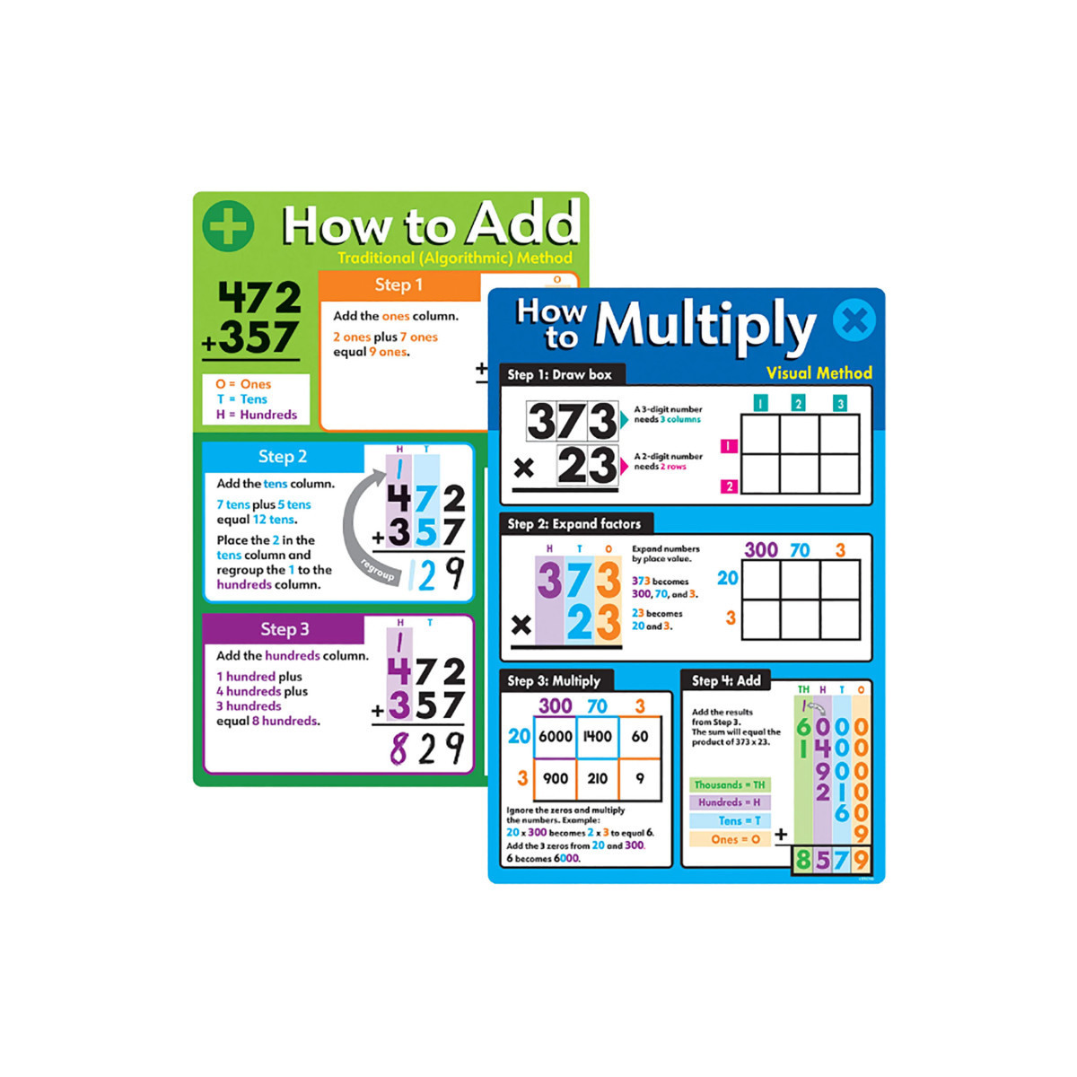 The Basic Math Operations Learning Set includes 8 posters: two each for Addition, Subtraction, Multiplication, and Division. Each operation has a poster featuring traditional (algorithmic) math methods as well as a poster illustrating visual math strategies. Encourage learners to explore, practice, and master each of these basic math functions.