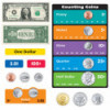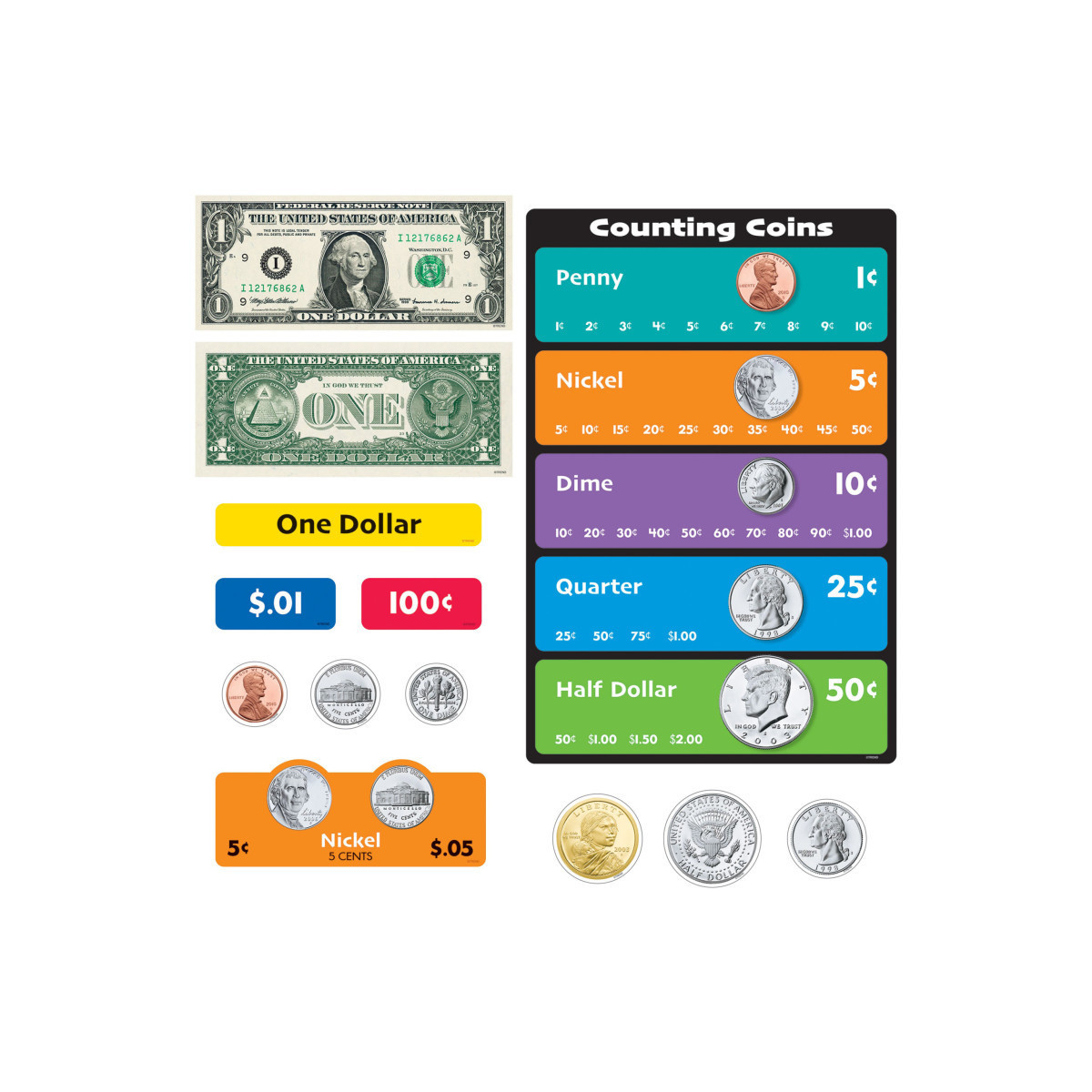Each 85-piece U.S. Money Learning Set includes fronts and backs of five bills, from $1 to $50, and six coins from penny to dollar, plus labels in numbers and words. Money Equivalency, Counting Coins, and Making CENTS of Change posters provide practical visual aids for gaining confidence with understanding money.