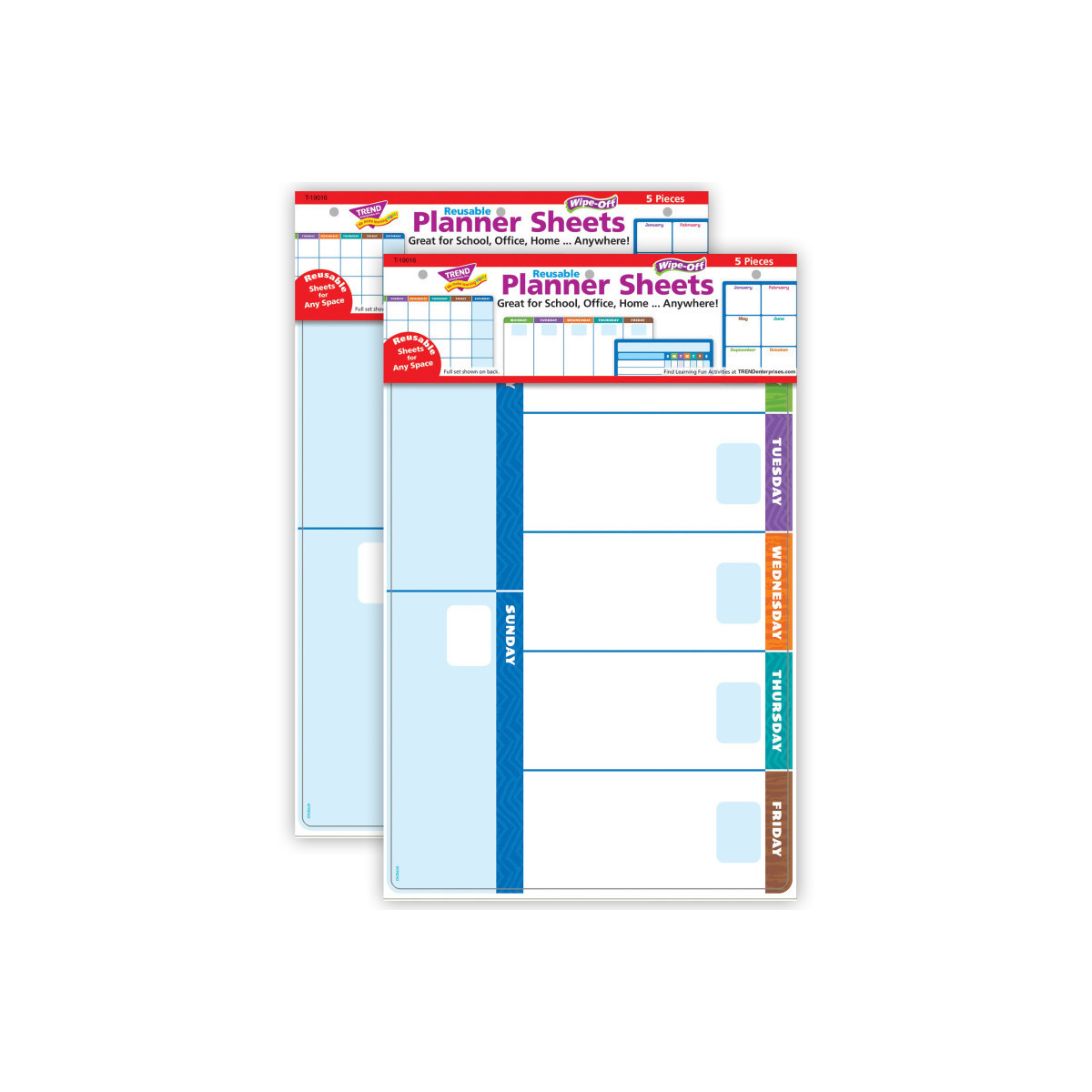 Change of plans? TREND's Wipe-Off® Planner Sheets Learning Set has you covered! Reusable weekly, monthly, and 12-month undated calendars offer a convenient way to organize schedules and stay on track. Two reusable project sheets give visibility to progress on scheduled task assignments and chores. Surfaces are specially coated to write on and wipe clean easily with a dry-erase marker - use again and again in classrooms, offices, homes, community centers, and more. Sized right for placement on refrigerators, cabinets, and doors - wherever you need a bit of space. Printed on durable, heavier-weight paper and packaged in an easy-seal reusable bag for storage. Made in the USA. Each set includes 5 reusable sheets, up to 10-3/4 inches x 16-1/8 inches. Sold as 2 complete sets for a total of 10 sheets.