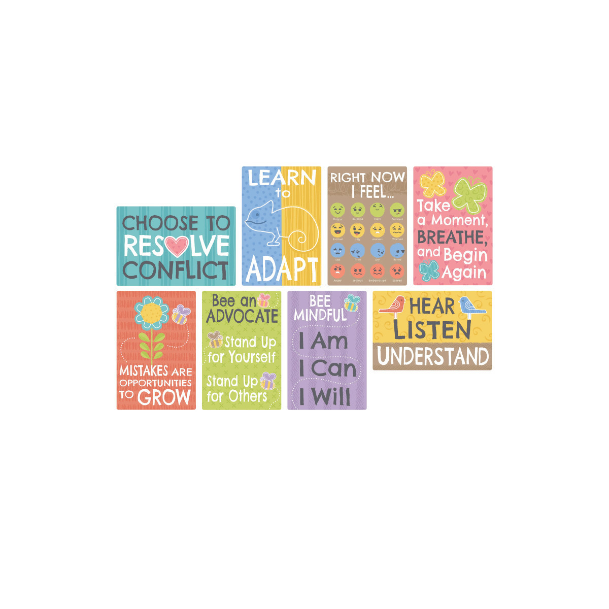 Foster a nurturing space with the 8 posters in the Ready to Grow Learning Set. Display one poster at a time or all at once to help learners increase self-awareness, express emotions, and grow compassion. Perfect for creating cozy areas and calm, quiet zones. Encourage students to pick a poster to discuss, then talk about ways to put it into practice. These conversations help increase self-advocacy, supporting kids on a path to emotional well-being. Encouraging messages, calming colors, and natural images help make classrooms, homes, offices, libraries, conference rooms, cafeterias, and hallways inviting spaces ready to help kids grow.