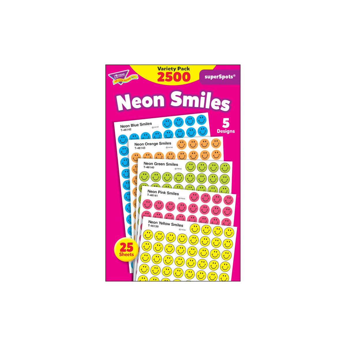 Popular superSpots® pack proves variety is the spice of life! Bright colors and amazing designs to motivate, collect, trade, and celebrate success. So many uses! Acid free, nontoxic, and safe for photos. 5 colors (Neon Yellow, Neon Green, Neon Pink, Neon Blue, Neon Orange), 2,500 stickers.