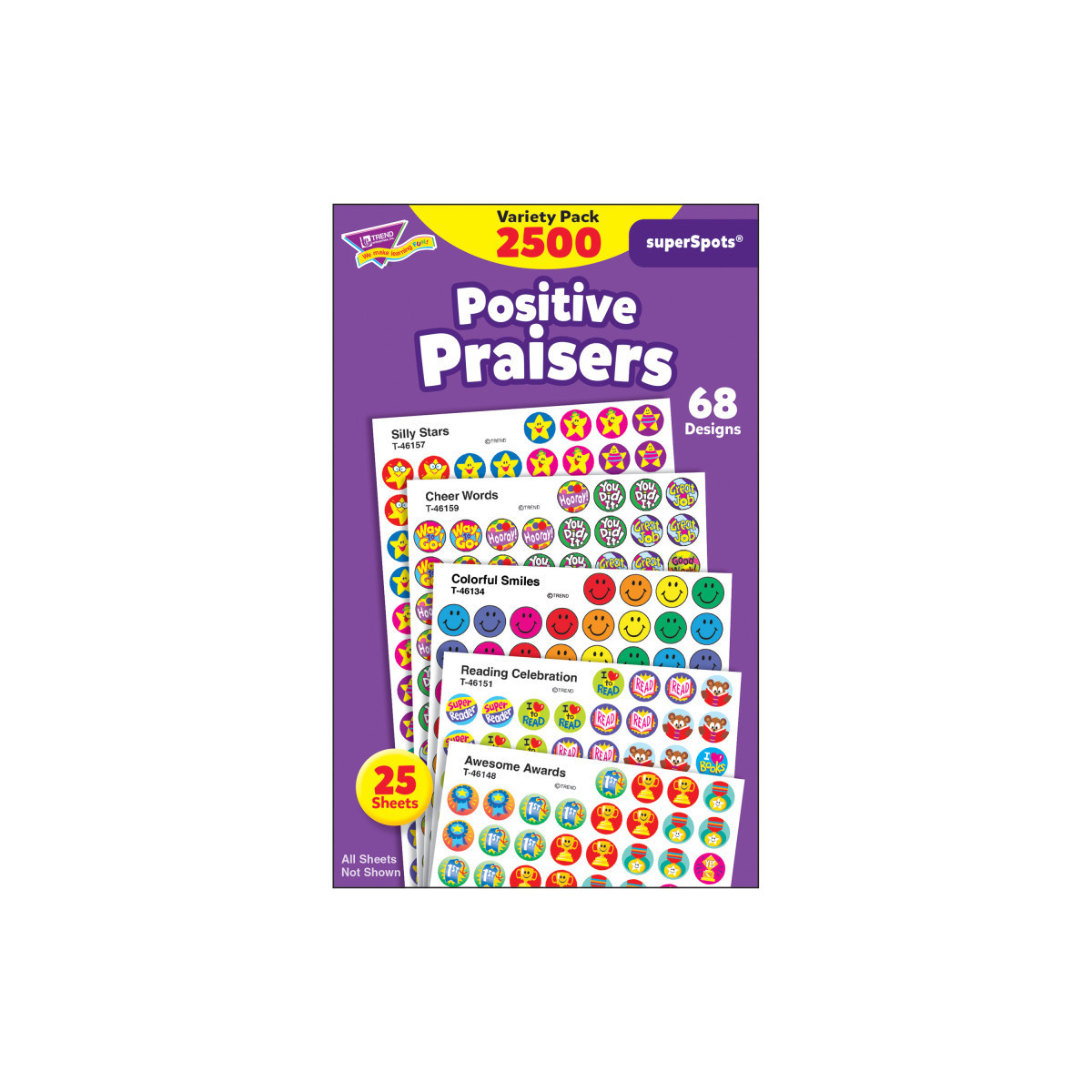 Popular superSpots® pack proves variety is the spice of life! Bright colors and amazing designs to motivate, collect, trade, and celebrate success. So many uses! Acid free, nontoxic, and safe for photos. 68 designs (Super Words, TREND Kids, Colorful Smiles, Awesome Awards, Reading Celebration, Happy Smiles, Silly Stars, Cool Words, Beaming Rainbows, and Cheer Words), 2,500 stickers.