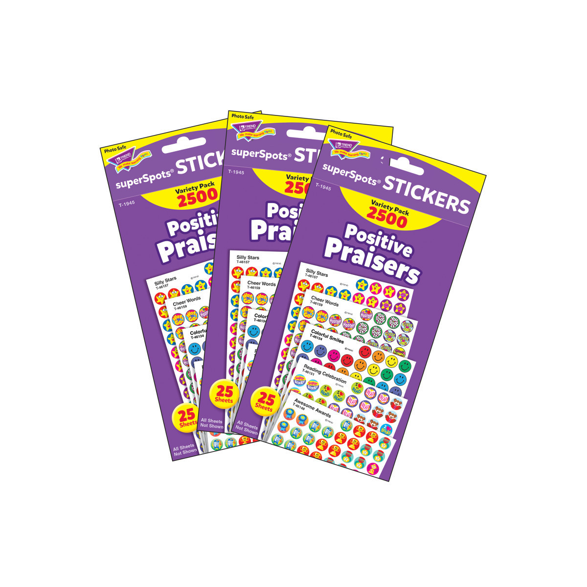 Popular superSpots pack proves variety is the spice of life! Bright colors and amazing designs to motivate, collect, trade, and celebrate success. So many uses! Acid free, nontoxic, and safe for photos. 68 designs (Super Words, TREND Kids, Colorful Smiles, Awesome Awards, Reading Celebration, Happy Smiles, Silly Stars, Cool Words, Beaming Rainbows, and Cheer Words), 2500 stickers per pack. Sold as 3 packs for a total of 7500 stickers.