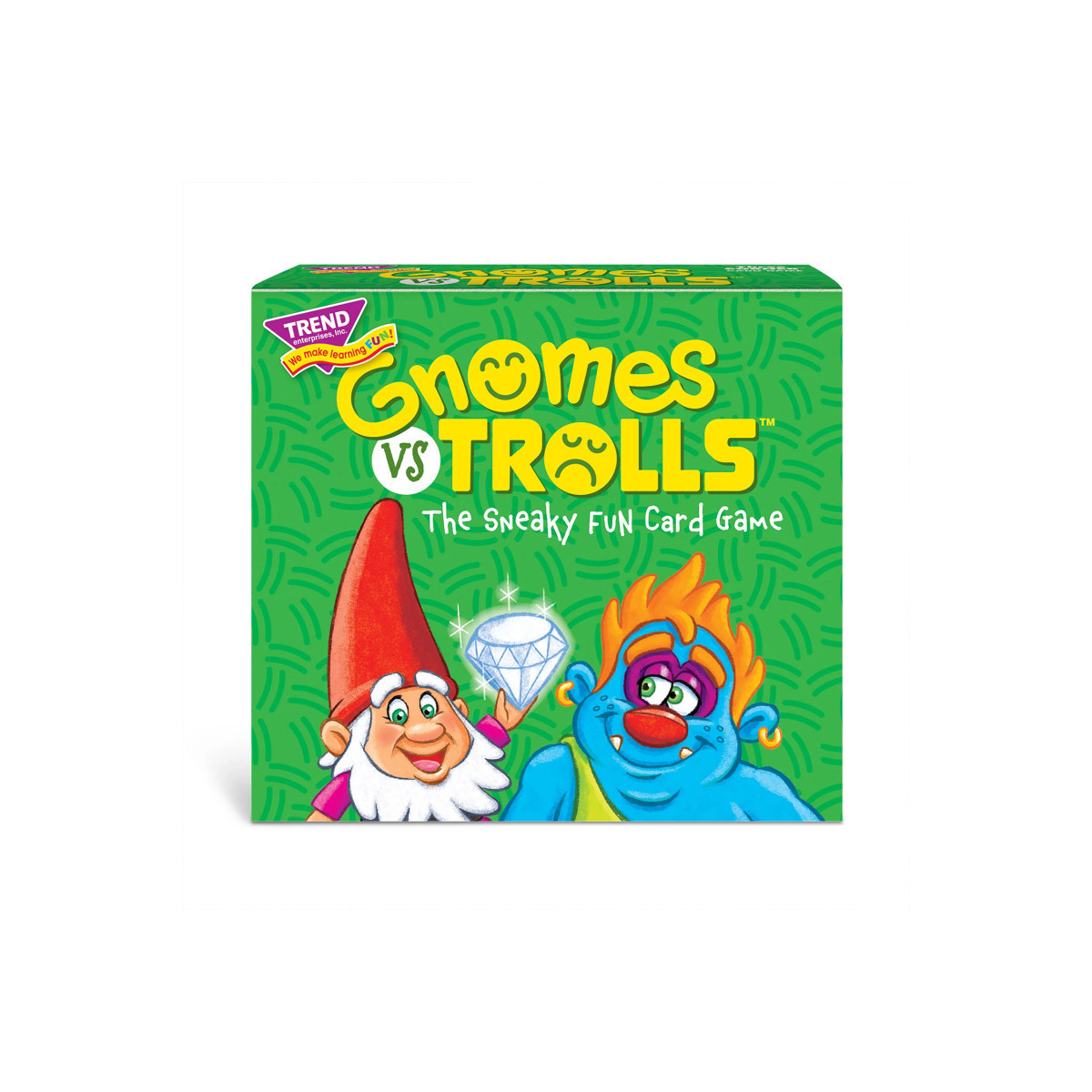 Gnomes vs Trolls card game has lots of sneaky fun to treasure! Enjoy a delightful mix of beginner strategy and unsuspecting surprises with this loveable family card game. Gather the most treasure and save it from the tricky trolls to win! Tricky trolls are lurking, turning up when they're least expected. Flip a card to find your fate: a gnome, treasure, or a TROLL! Nine thieving trolls surprise unsuspecting gnomes, take their treasure, and put an end to their gathering games. It's up to players to surround their treasure cards with gnomes to protect it, but remember, when the 9th troll card turns up, time's up! Unique, three-sided cards with storybook illustrations give players lots of fun surprises to spot. The inventive pyramid "troll timer" creates suspense – no two rounds of the game play the same way! Quick setup and play makes Gnomes vs Trolls card game perfect for birthdays, parties, gatherings, and family game nights too. 63 cards plus full-color instructions included. 30-minute play time. 2-4 players, ages 4 to adult. Made in USA.