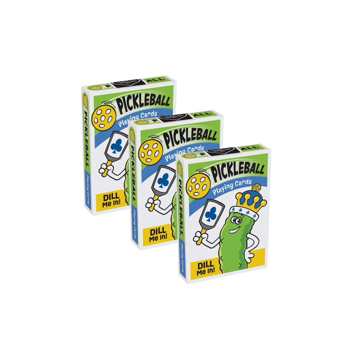 Grab some friends for a hand of our exclusive Pickleball Card Game (instructions included.) This thrilling game captures much of what you like about the actual game itself! Or use the cards as you would any other standard deck. Either way, you'll have a DILL-ightful time! Box includes 52 durable playing cards, 2 jokers, 2 information cards including QR code link for instructions for 2 or 4 players. Standard playing card size (3.47" x 2.47"). Made in USA. Sold as a pack of 3 boxes of playing cards.