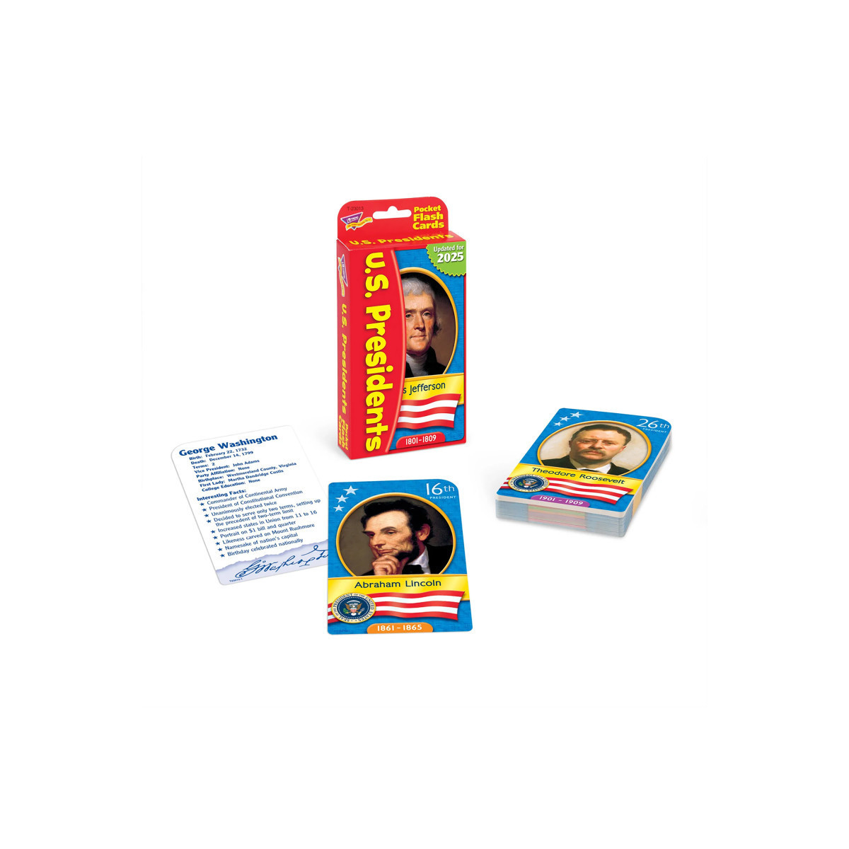 This flash card pack, complete with activities, teaches facts about the 46 U.S. presidents. Features official White House Historical Association portraits of 46 presidents, 8 era cards, and political party history. Updated to include President Biden. Watch students enjoy learning and build skills on their own or with their friends ... at school, home, or on the go! Durable, no-see-through cards with quick sorting, rounded corners. 56 two-sided cards, 3 1/8" x 5 1/4".
