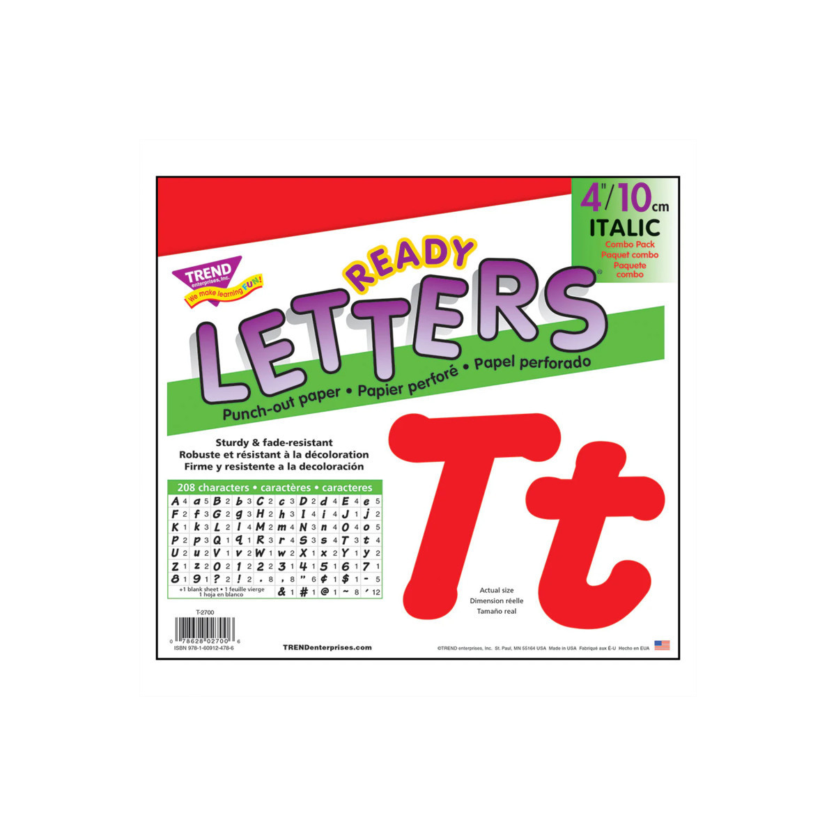 Lively letters, limitless possibilities! Convenient, reusable, and easy to use. Great for student work displays, bulletin boards, signs, banners, news boards, learning activities, labeling, and much more! Fade-resistant colors coordinate with TREND products. Durable. Includes 56 uppercase letters, 83 lowercase letters, 13 numerals 0-9, 27 punctuation marks, 14 Spanish accent marks, and 1 blank sheet.