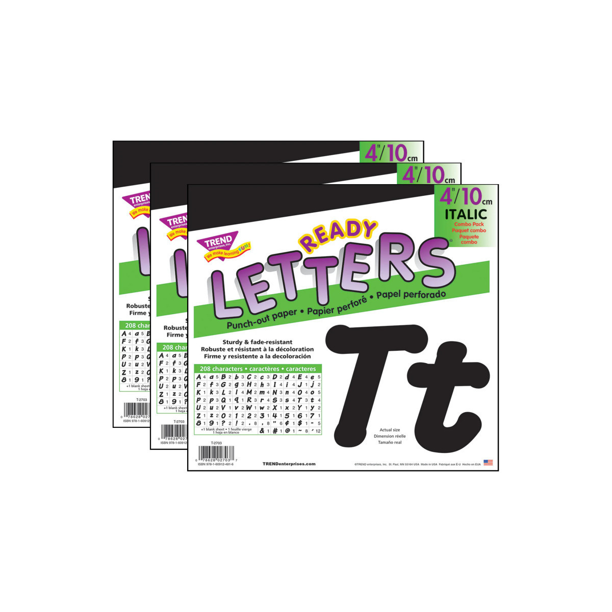 Lively letters, limitless possibilities! Convenient, reusable, and easy to use. Great for student work displays, bulletin boards, signs, banners, news boards, learning activities, labeling, and much more! Fade-resistant colors coordinate with TREND products. Durable. Each pack includes 56 uppercase letters, 83 lowercase letters, 13 numerals 0-9, 27 punctuation marks, 14 Spanish accent marks, and 1 blank sheet. Sold as 3 packs for a total of 582 pieces.