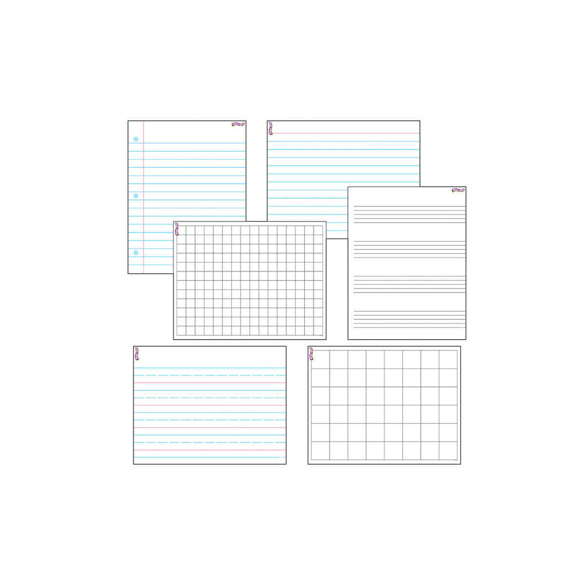 - 6 charts: Notebook Paper, Index Card, Graphing Grids (Small, Large), Staff Paper, Handwriting Paper.