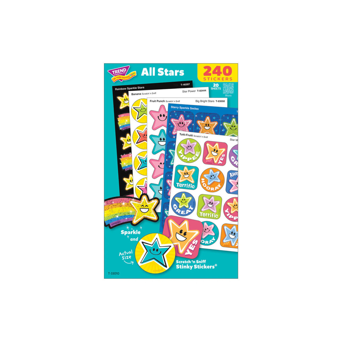 Smiles for miles! This handy assortment of 240 stickers includes four sheets each of Rainbow Sparkle Stars and Starry Sparkle Smiles designs, as well as four sheets each of the Stinky Stickers titles Big Bright Stars, Star Me Up, and Star Power. Stickers are nontoxic, acid-free, and great for use in scrapbooks and journals as well as in crafts, correspondence, and awards. Stickers are of various sizes, and are made in the USA.