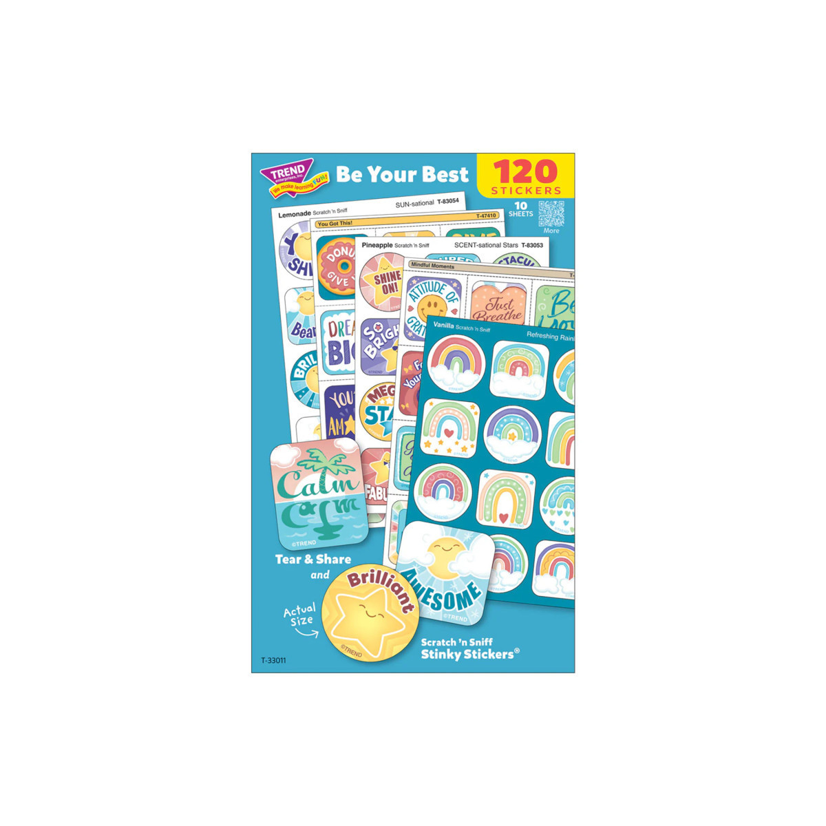 Prepare to motivate! This handy assortment of 120 stickers includes two sheets each of the Tear & Share titles Mindful Moments and You Got This!, and two sheets each of the Stinky Stickers titles SCENT-sational Stars, Refreshing Rainbows, and SUN-sational. Stickers are nontoxic, acid-free, and great for use in scrapbooks and journals as well as in crafts, correspondence, and awards. Stickers are of various sizes, and are made in the USA.