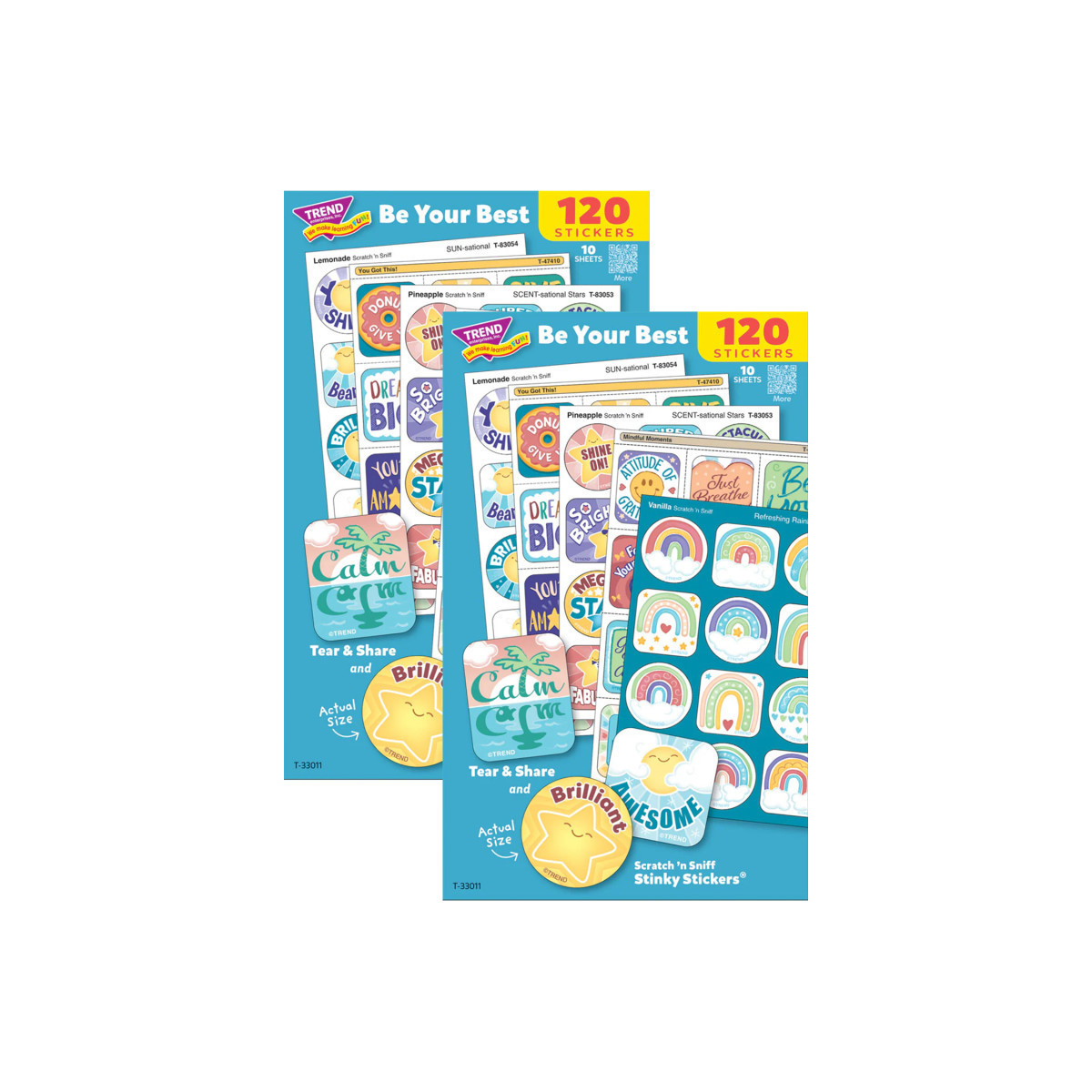 Prepare to motivate! Each handy assortment pack of 120 stickers includes two sheets each of the Tear & Share titles Mindful Moments and You Got This!, and two sheets each of the Stinky Stickers titles SCENT-sational Stars, Refreshing Rainbows, and SUN-sational. Stickers are nontoxic, acid-free, and great for use in scrapbooks and journals as well as in crafts, correspondence, and awards. Stickers are of various sizes, and are made in the USA. Sold as 2 packs for a total of 240 stickers.