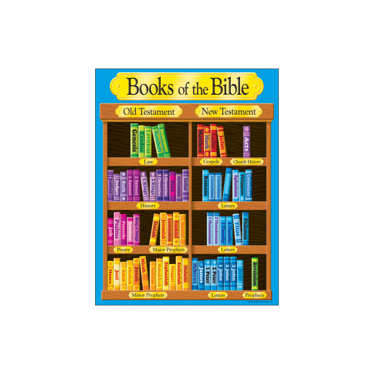 Introduce all the books of the Bible with this colorful chart. Explore which books are part of the Old Testament and which are in the New Testament. Shelving tags indicate the type of book to further enhance learning. Durable. Extra Value: Reproducibles on back.17" x 22".