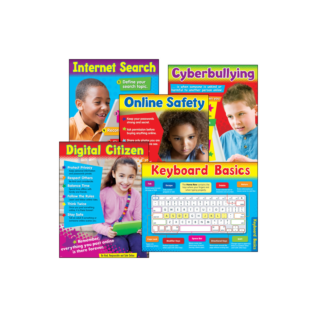 Learn several ways to be safe and responsible online. Convenient combo pack includes 5 technology-themed charts: Digital Citizen, Online Safety, Cyberbullying, Internet Search, and Keyboard Basics. Durable & reusable. Activities on all chart backs. 17" x 22".