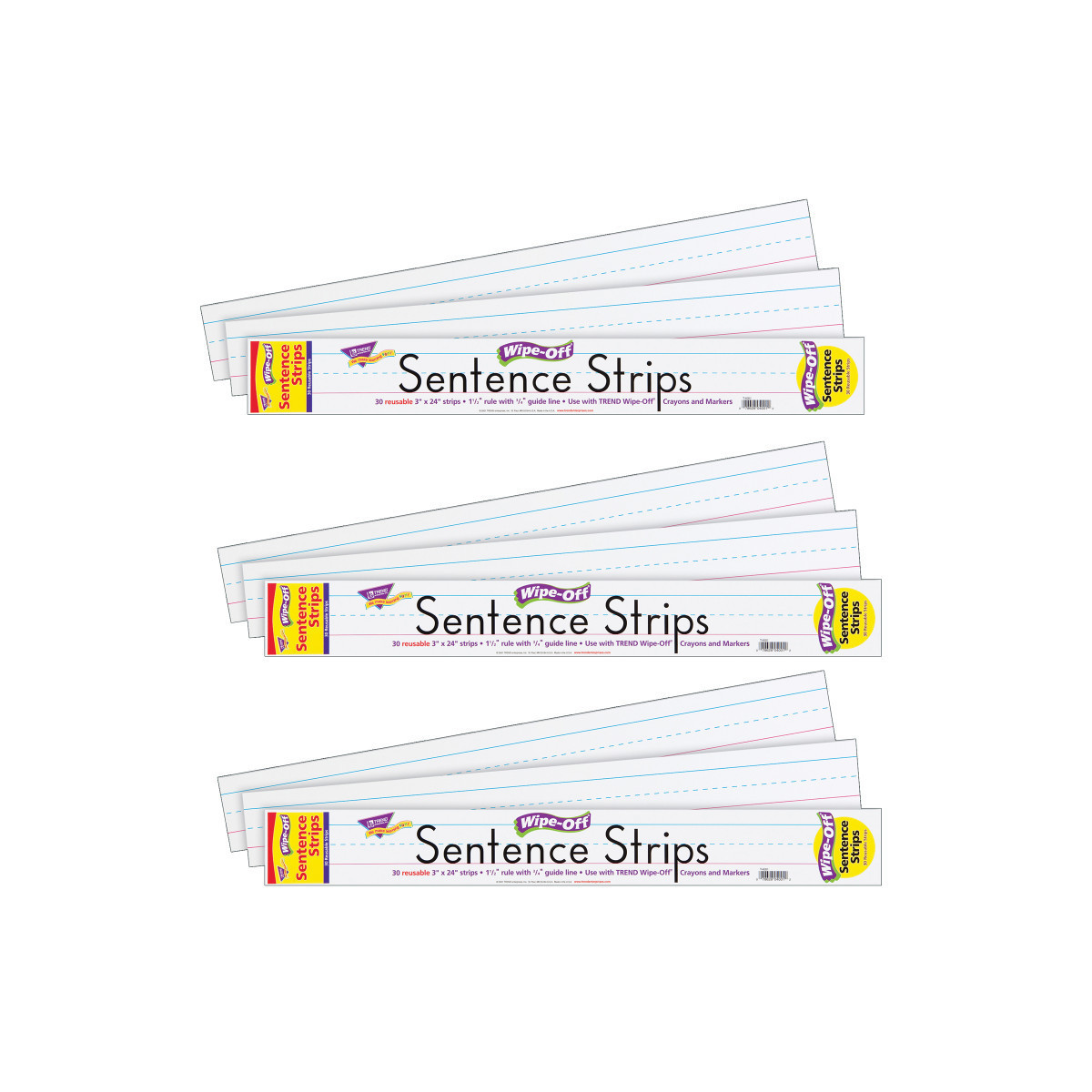 Perfect for classroom demonstrations, printing and writing practice, word walls, story walls, spelling practice, and announcements. Give kids a chance to practice again and again! Class-size packs make it easy for everyone to have the hands-on practice that delivers results. White with blue standard guidelines. 30 reusable, 3" x 24" strips per pack. Sold as 3 packs for a total of 90 sentence strips.