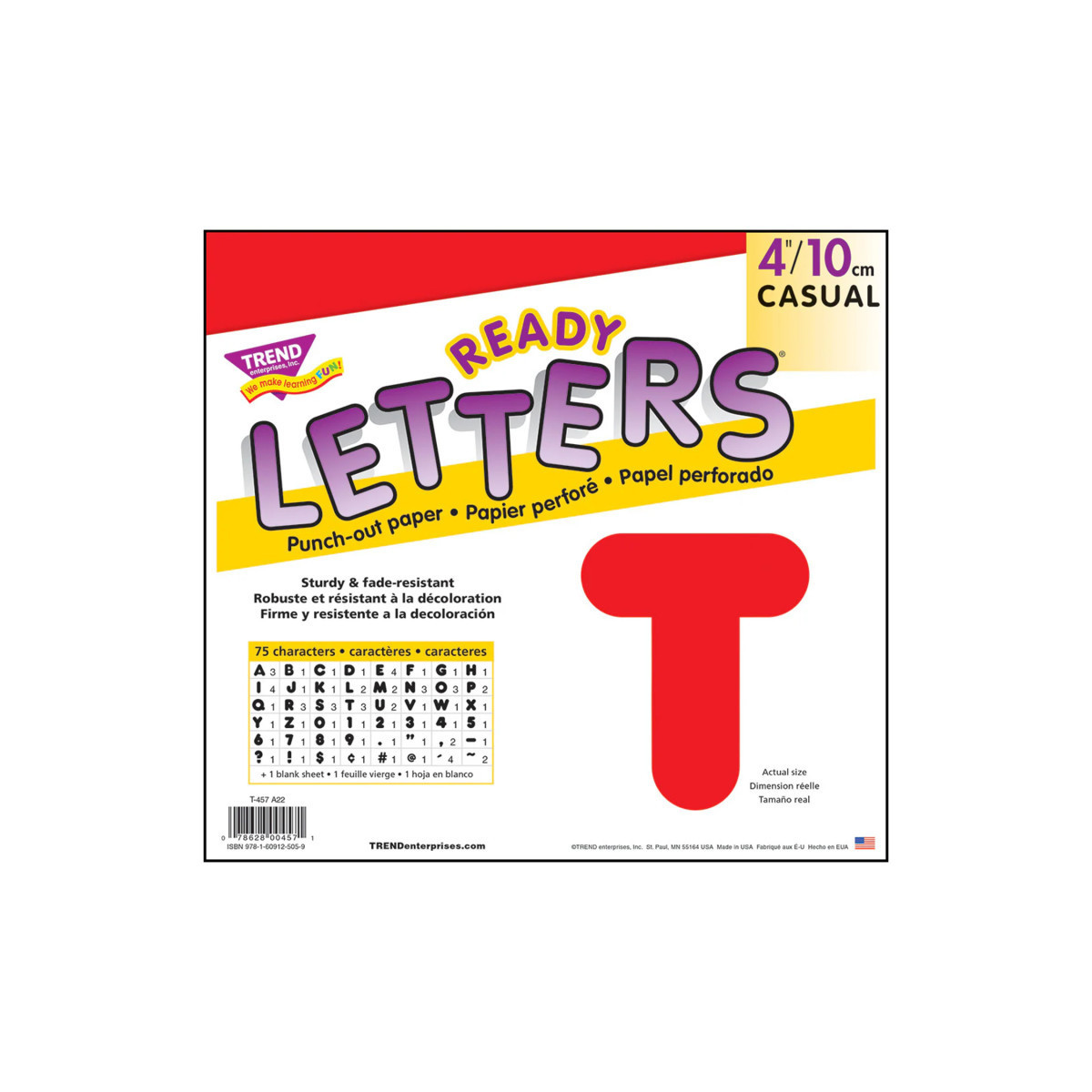 Lively letters, limitless possibilities! Convenient, reusable, and easy to use. Great for student work displays, bulletin boards, signs, banners, news boards, learning activities, labeling, and much more! Fade-resistant colors coordinate with TREND products. Durable. Includes 50 uppercase letters, 10 numerals 0-9, 11 punctuation marks, and 1 blank sheet.