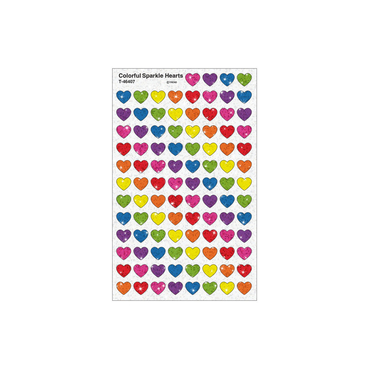 8 different colors of adorable sparkly hearts; perfect for incentive charts, rewards, crafts, and correspondence. 4 sheets per pack, 400 stickers in all. Stickers are 7/16" across. Acid-free, nontoxic, and great for use in scrapbooks and journals. Made in USA.