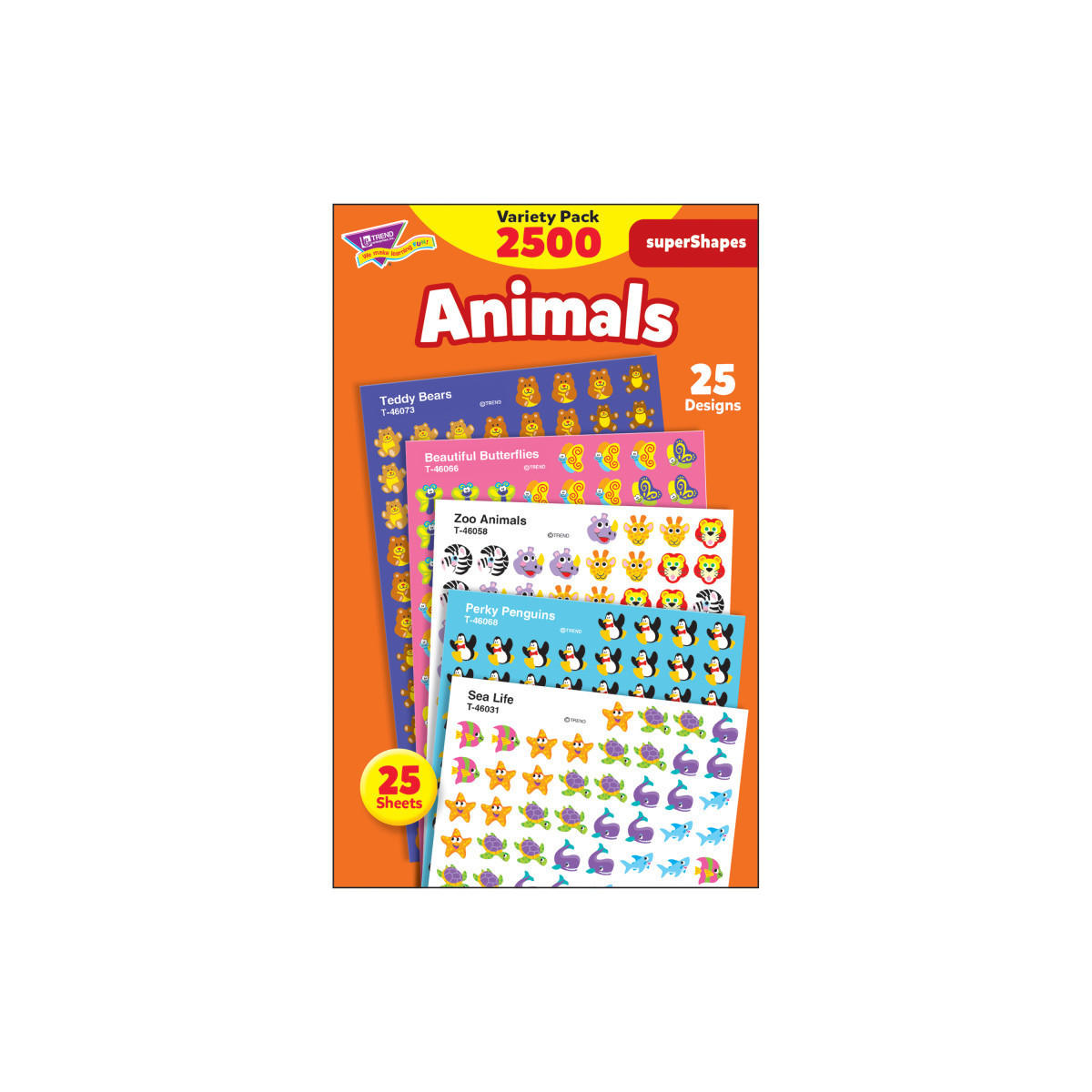 Popular superShapes pack proves variety is the spice of life! Great for kids and any occasion. Acid free, nontoxic, and safe for use on photos. 25 designs (Sea Life, Beautiful Butterflies, Perky Penguins, Teddy Bears, Zoo Animals), 2,500 stickers.