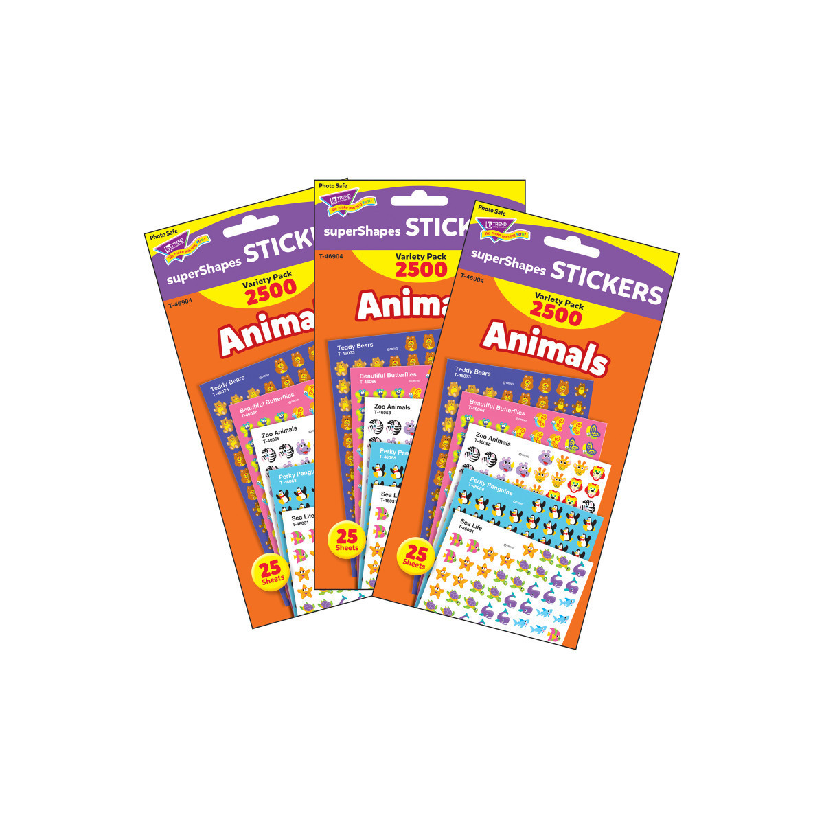 Popular superShapes pack proves variety is the spice of life! Great for kids and any occasion. Acid free, nontoxic, and safe for use on photos. Each pack includes 2500 stickers in 25 designs (Sea Life, Beautiful Butterflies, Perky Penguins, Teddy Bears, Zoo Animals). Sold as 3 packs for a total of 7500 stickers.