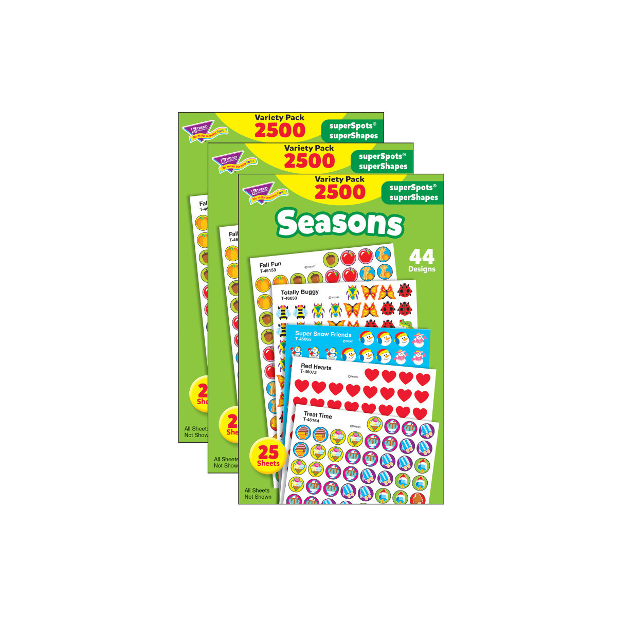 Handy favorites! superSpots® and superShapes Stickers provide extra value in every pack. Designs include Fall Fun, Turkey Time, Super Snow Friends, Winter Joys, Red Hearts, Spring Flowers, Totally Buggy, Treat Time, and Patriotic Symbols. Acid free, nontoxic, and safe for photos. Each pack includes 2500 stickers in 44 designs. Sold as 3 packs for a total of 7500 stickers.
