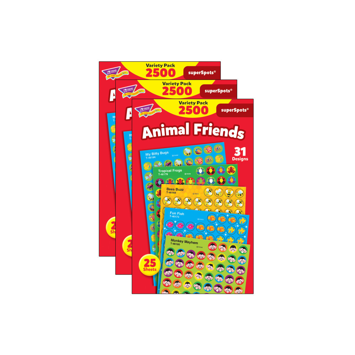 Popular superSpots® pack proves variety is the spice of life! Bright colors and amazing designs to motivate, collect, trade, and celebrate success. So many uses! Acid free, nontoxic, and safe for photos. Each pack includes 2500 stickers in 31 designs (Tropical Frogs, Monkey Mayhem, Itty Bitty Bugs, Fun Fish, Bees Buzz). Sold as 3 packs for a total of 7500 stickers.