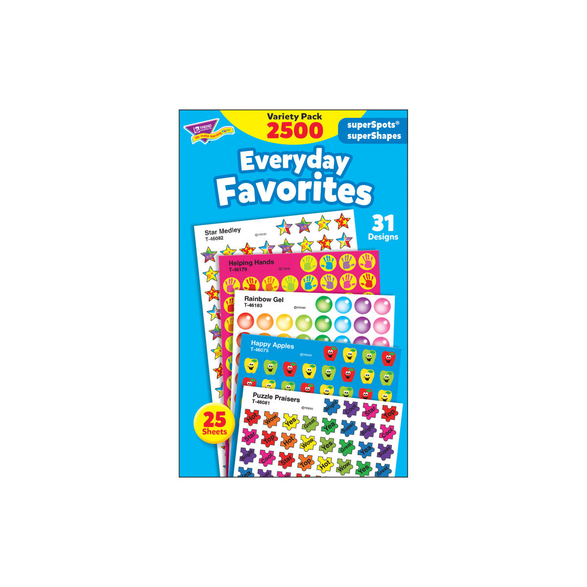 An array of stickers for all your creative needs! Small size is perfect for use with TREND Incentive Charts and Pads. Acid-free, nontoxic, and photo-safe. 25 sheets; 2500 stickers.