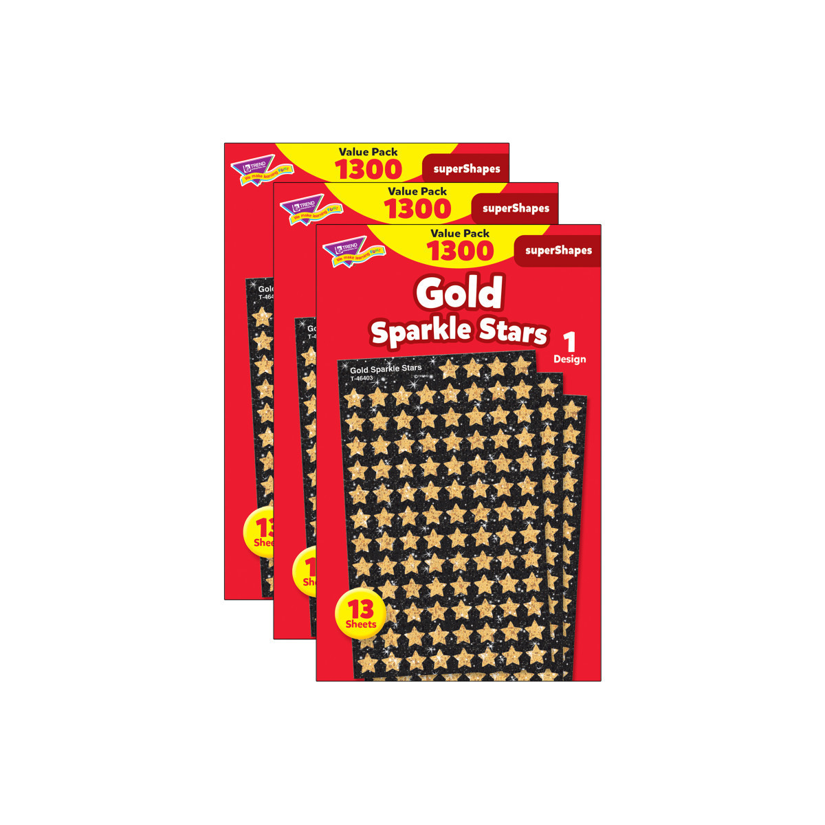 Themed superShapes Stickers are fast favorites at a great value, and these classic gold sparkle stars are always welcome to see! Fun for student rewards and on homework folders. Just the right size for Incentive Charts and Incentive Pads. Acid free, nontoxic, and safe for photos. Each pack includes 1300 stickers. Sold as 3 packs for a total of 3900 stickers.