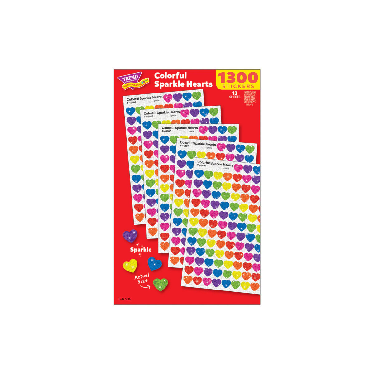 8 different colors of adorable sparkly hearts; perfect for incentive charts, rewards, crafts, and correspondence. 13 sheets per pack, 1,300 stickers in all. Stickers are 7/16" across. Acid-free, nontoxic, and great for use in scrapbooks and journals. Made in USA.