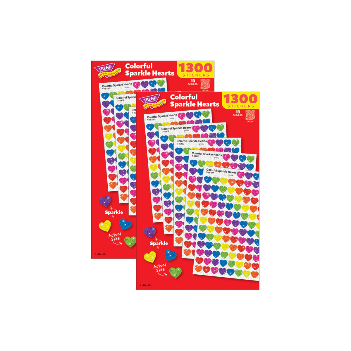 8 different colors of adorable sparkly hearts; perfect for incentive charts, rewards, crafts, and correspondence. Stickers are 7/16" across. Acid-free, nontoxic, and great for use in scrapbooks and journals. Made in USA. Each pack includes 1300 stickers on 13 sheets. Sold as 2 packs for a total of 2600 stickers.