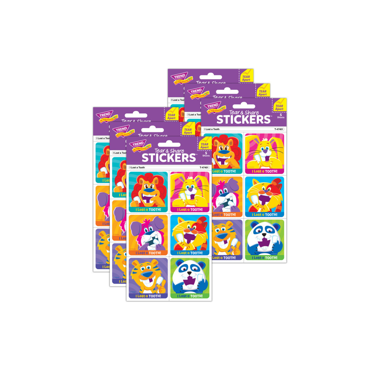 Help growing kids share the excitement of losing a tooth with I Lost a Tooth Tear & Share Stickers. Just tear apart at the perforated line to separate a sticker from the rest of the sheet - no stickers needed, and the recipient can place their sticker wherever they like! Kids proudly wear these big, bold stickers or put them on papers and folders. Stickers measure 1-7/8" x 1-15/16". Nontoxic, acid-free, and photo safe. Each pack includes 30 stickers. Sold as 6 packs for a total of 180 stickers.