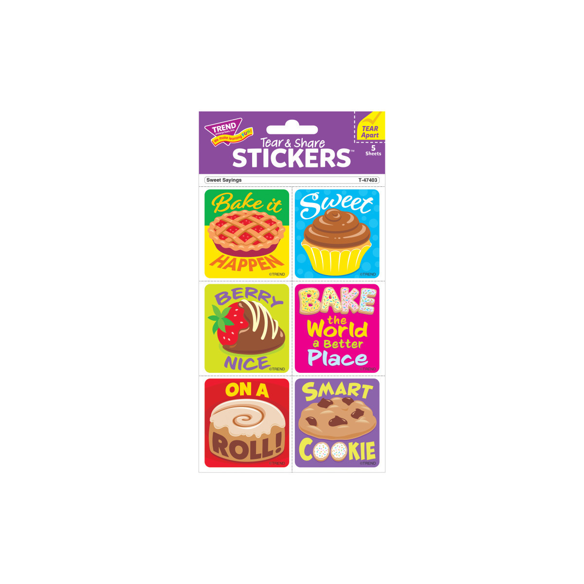 Sharing your love of stickers is now simpler and more fun with TREND Tear & Share Stickers. Just tear apart at the perforated line to separate a sticker from the rest of the sheet - no scissors needed, and the recipient can place their sticker wherever they like! Perfect for motivation, party favors, rewards, collecting, and more. Stickers measure 1-7/8" x 1-15/16". Nontoxic, acid-free, and photo safe. 5 sheets; 30 stickers per pack.