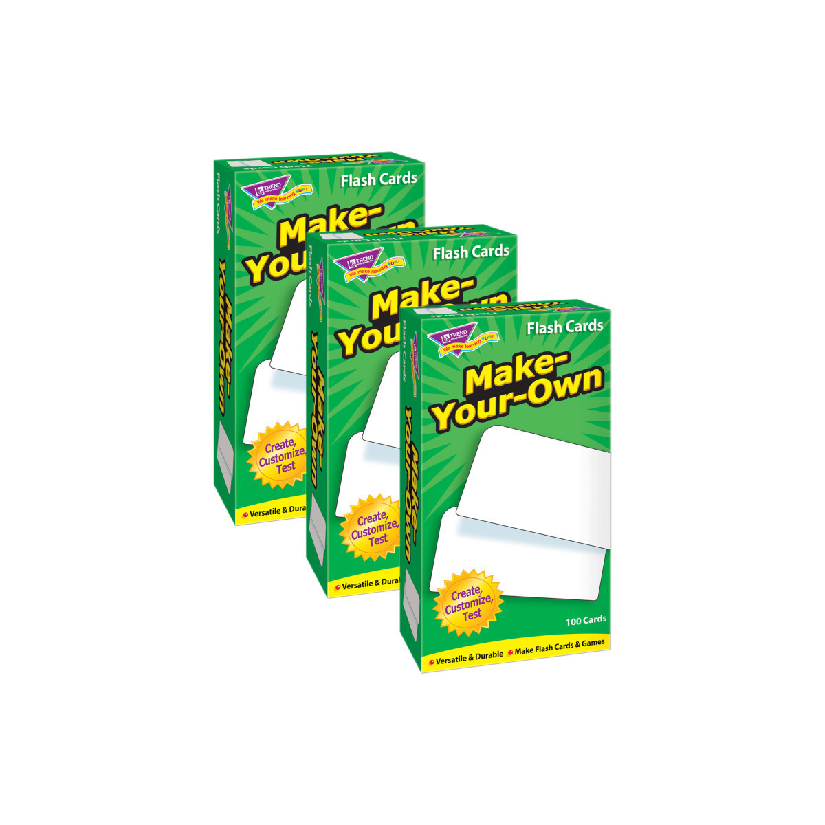 Versatile cards do their job, helping you teach students new skills in a fun way. Add to sets or create your own. Sturdy cards and storage box. No-see-through cards with quick-sorting, rounded corners. 100 blank cards per pack, 3" x 6". Sold as 3 identical packs of flash cards.