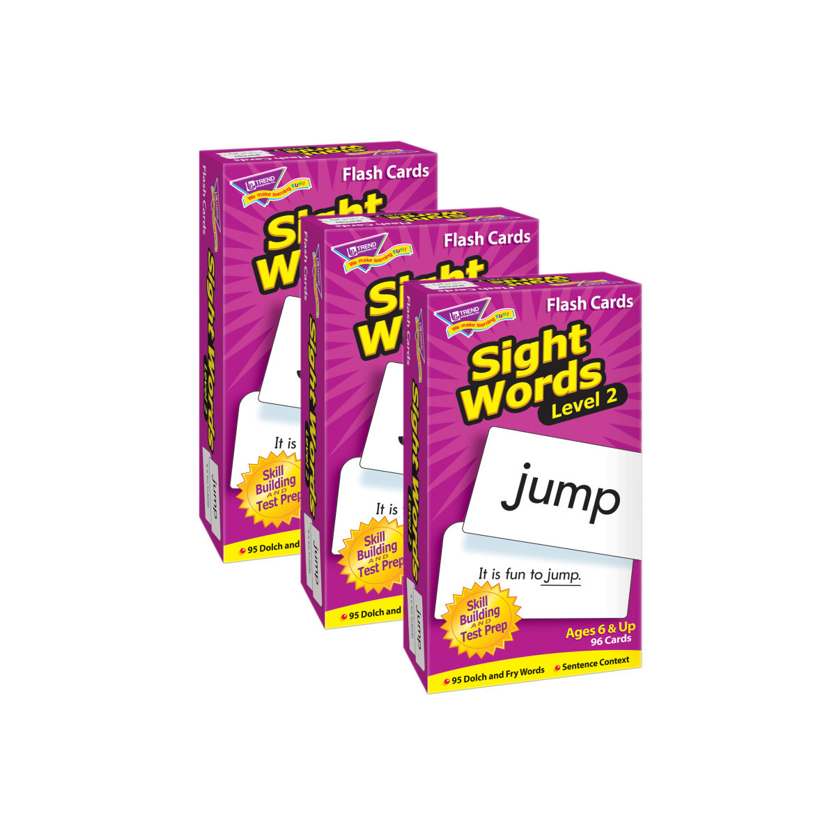 Content-rich sight word cards do their job, teaching students new skills in a fun way. This educational aid builds vocabulary skills using words from Dolch Words and Fry Instant Words lists for Grades 1 and 2. Word in a sentence on card backs. Sturdy cards and storage box. Students will delight in mastering new skills. No-see-through cards with quick-sorting, rounded corners. 96 cards per pack, 3" x 6". Sold as 3 identical packs of flash cards.