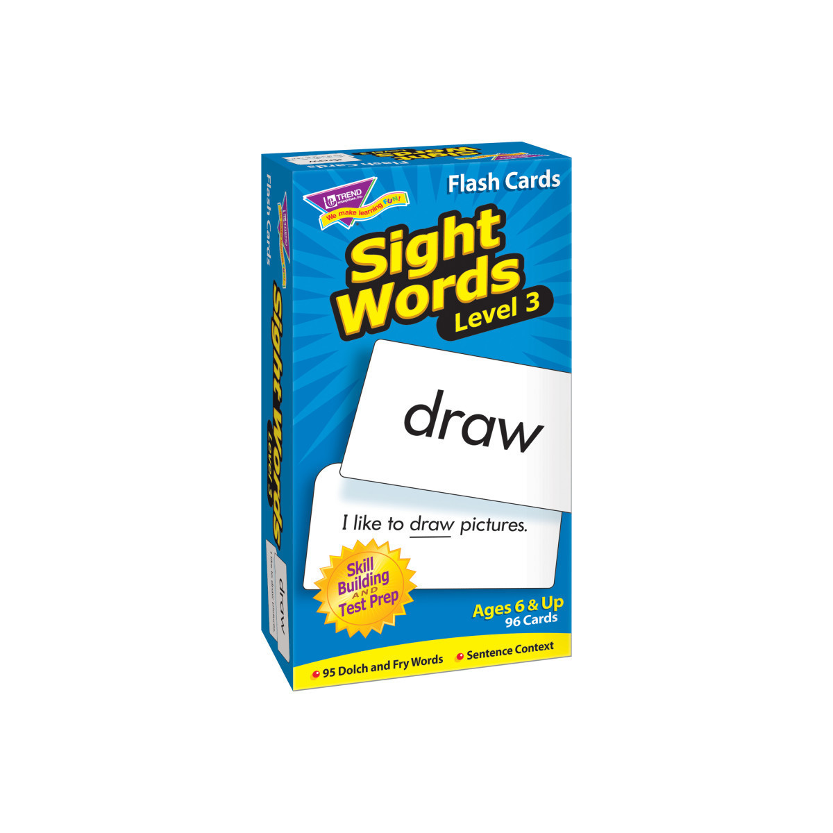 Content-rich sight word cards do their job, teaching students new skills in a fun way. This educational aid builds vocabulary skills using words from Dolch Words and Fry Instant Words lists for Grades 3 and 4. Word in a sentence on card backs. Sturdy cards and storage box. Students will delight in mastering new skills. No-see-through cards with quick-sorting, rounded corners. 96 cards, 3" x 6".