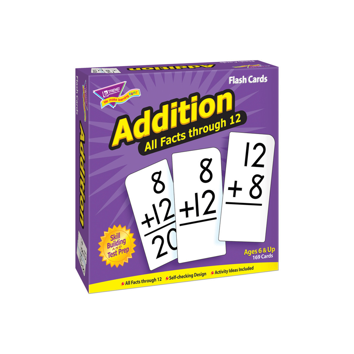 Content-rich math cards do their job, teaching students new skills in a fun way. This educational aid helps students build addition skills. Equations are presented 2 ways to reinforce skills. Complete tables for all numbers 0-12. Self-checking, answers on back. Sturdy cards and storage box. Students will delight in mastering new skills. No-see-through cards with quick-sorting, rounded corners. quick-sorting, rounded corners. Includes 169 cards, 3" x 6". For ages 6 and up.